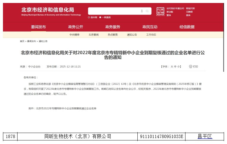 近日,北京市经济和信息化局发布公示,百洋医药集团旗下同昕生物技术(北京)有限公司(以下简称:同昕生物)成功通过复核,再次获评“北京市专精特新中小企业”。