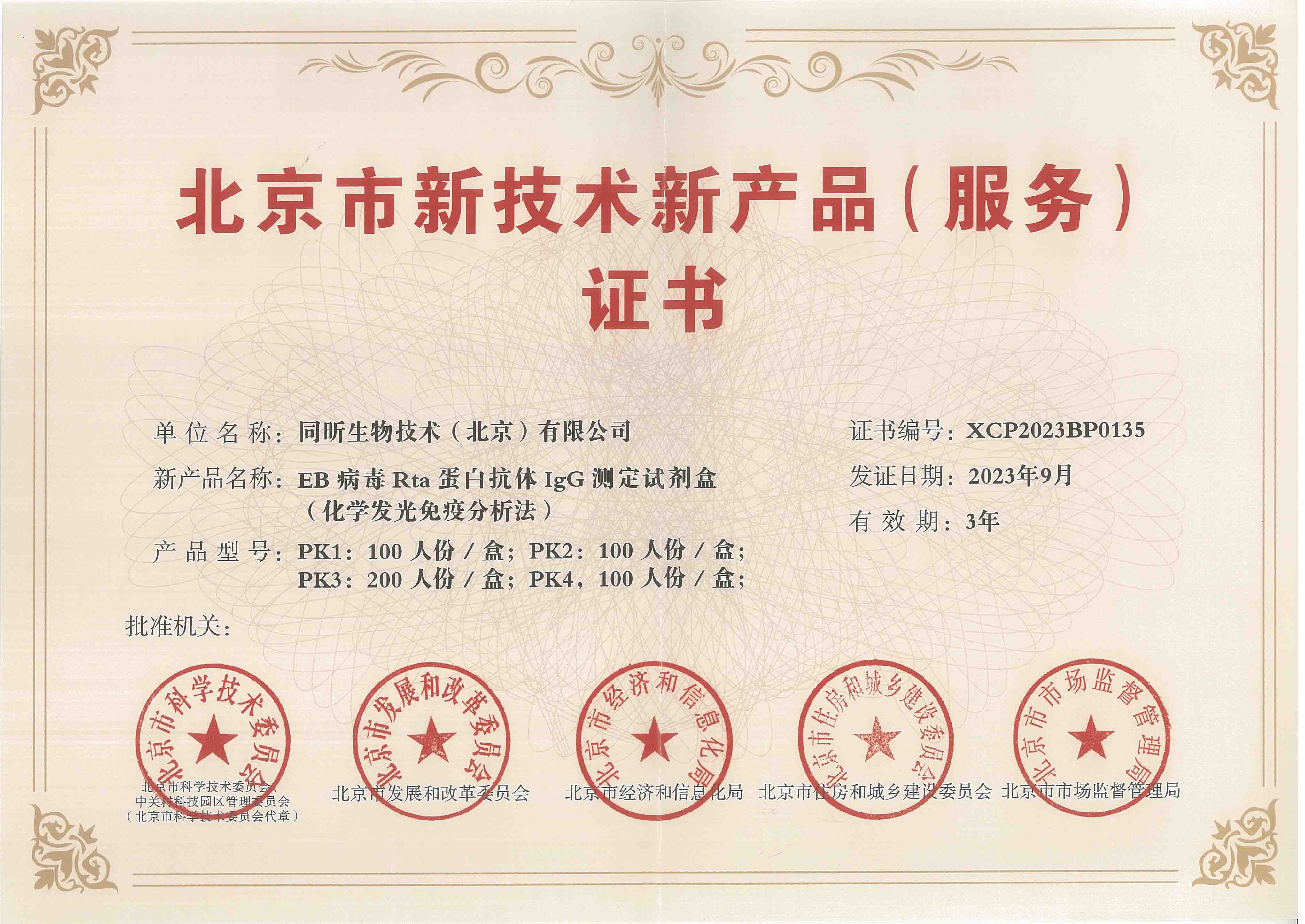 2023年9月,同昕生物自主研发的“EB病毒Rta蛋白IgG抗体测定试剂盒(化学发光免疫分析法)”被北京市科委等部门认定为“北京市新技术新产品(服务)”,并于2023年12月取得了认定证书。